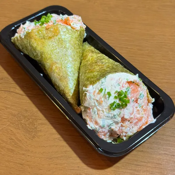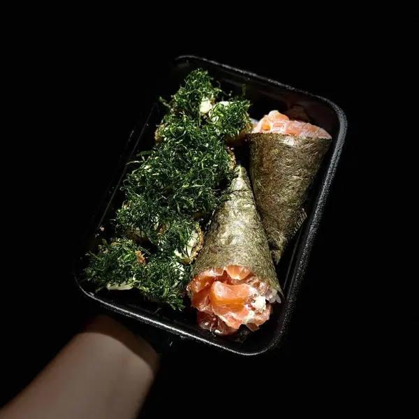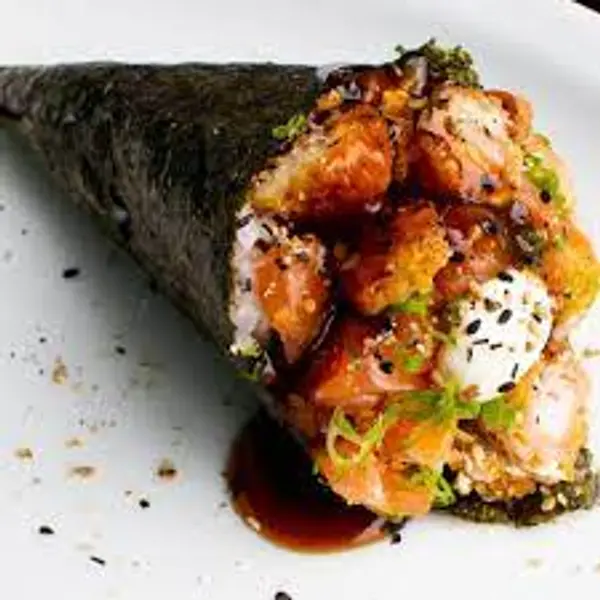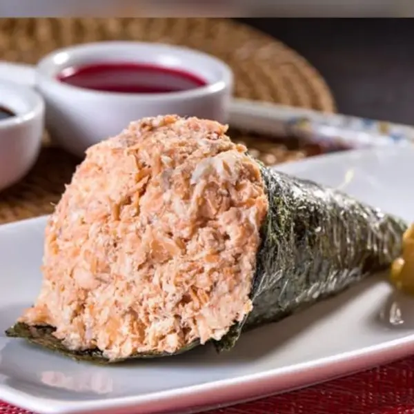 Temaki com recheio de Arroz, Salmão Grelhado, Cream Cheese e Cebolinha.