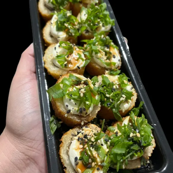 Delicioso Sushi Enrolado, Empanado e Frito com Salmão, Cream Cheese, Cebolinha, Doritos e Gergelim.
