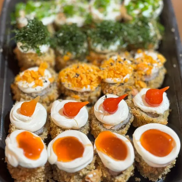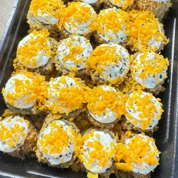 20x Unidades de Hot Roll Salmão Grelhado finalizado com Cream Cheese, Doritos e Gergelim.