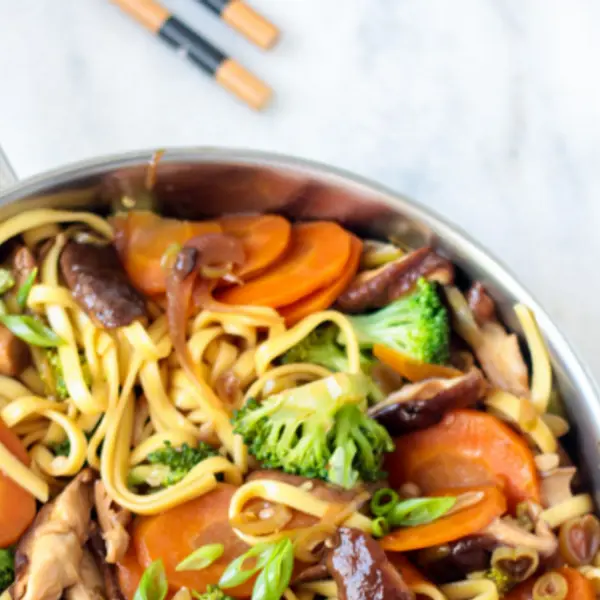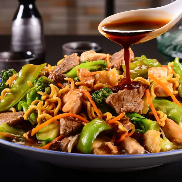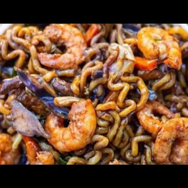 Macarrão Oriental, Carne Bovina, Frango e Legumes no Molho Especial.
