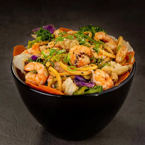 Macarrão Oriental com Camarões e Legumes Crocantes.